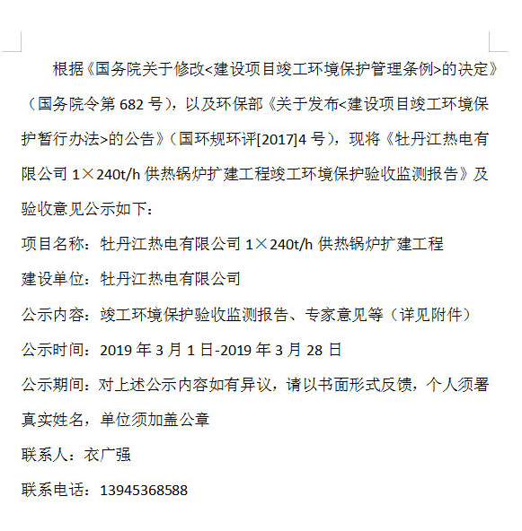 牡丹江熱電有限公司1×240t/h供熱鍋爐擴建工程項目竣工環(huán)境保護驗收監(jiān)測公示